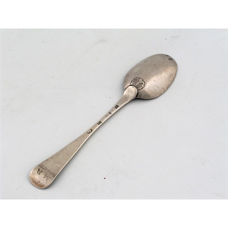 A mid 18th century unascribed fancy back tablespoon, with a small shell below the drop, scratched 'MR' over 'Jan 12.1735', struck twice with a makers mark 'IA' and twice with another mark 'P'?, c.1735, 1oz.