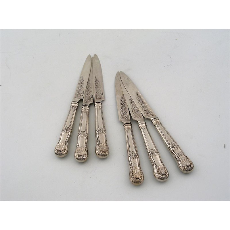 By Paul Storr: a set of 6 George III hourglass pattern dessert of fruit knives, with decorated blades, engraved crest and motto 'LIBERTAS', London 1818. (6)