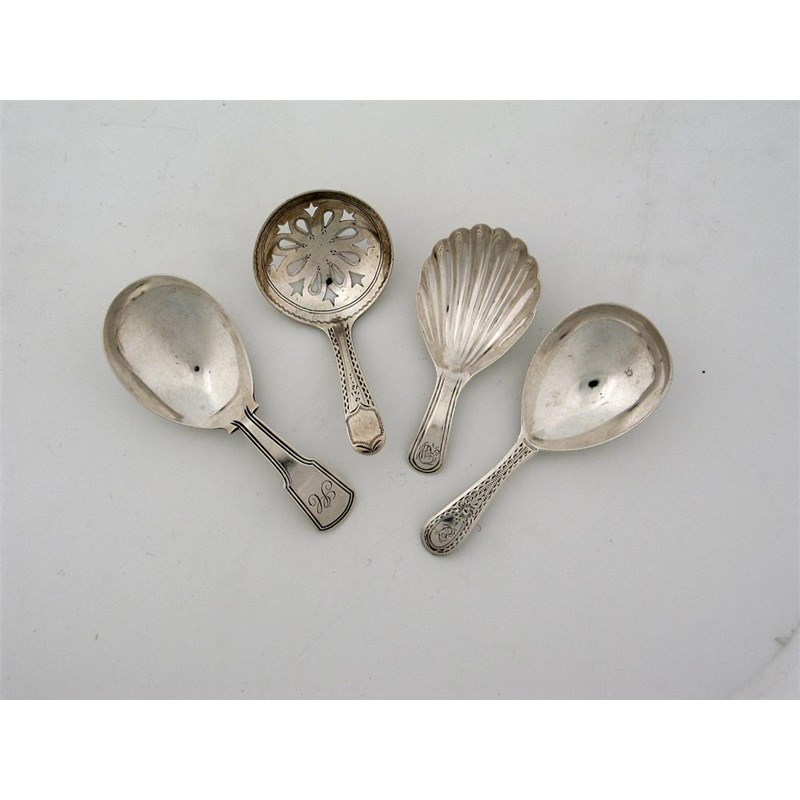 A George III bright cut caddy spoon, with a pierced bowl, by George Burrows, London 1798 and three other George III caddy spoons. (4)