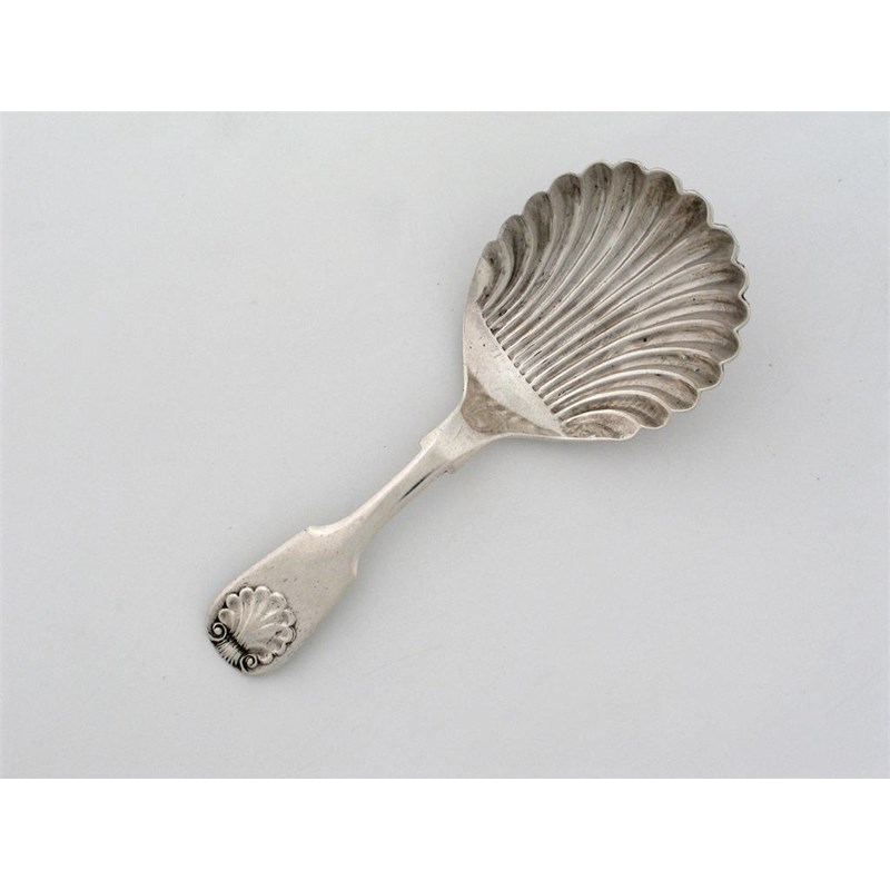 A Victorian Scottish caddy spoon, with fiddle and shell stem and a fluted bowl, by William Marshall Edinburgh 1844.