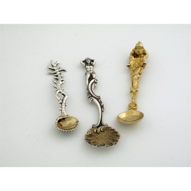 Three cast saltspoons: a nautical example with coral stem, by Francis Higgins, London 1869, a figure terminal example with shell bowl by C. Rawlings and W. Summers, London 1830 and a silvergilt example, with elves, unmarked. (3)