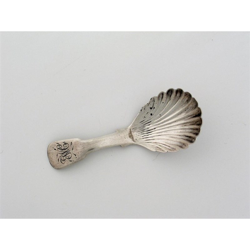 A William IV provincial fiddle caddy spoon, fluted bowl, initialled 'EWC', by Peter Lambert (of Berwick upon Tweed) with Newcastle mark for 1836.