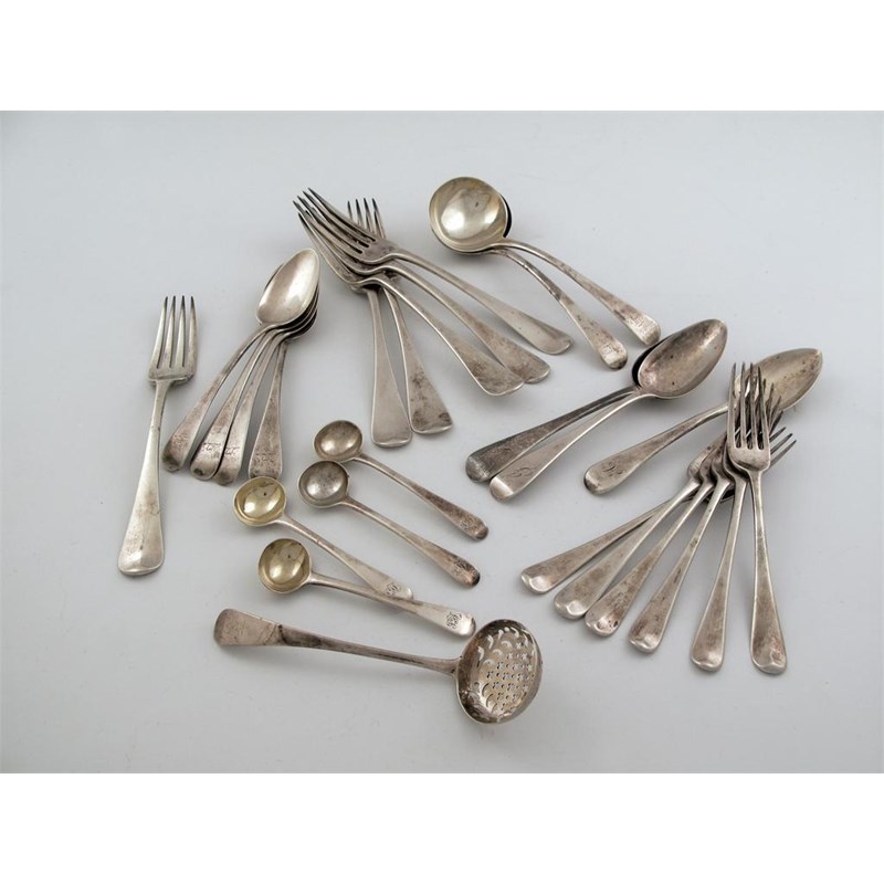 Old English pattern flatware, George III-George IV: six tableforks, six dessert spoons, a pair of sauce ladles, four salt spoons and a sugar ladle, some crested or initialled, mixed makers and dates, London 1806-1821, 33oz. (26)