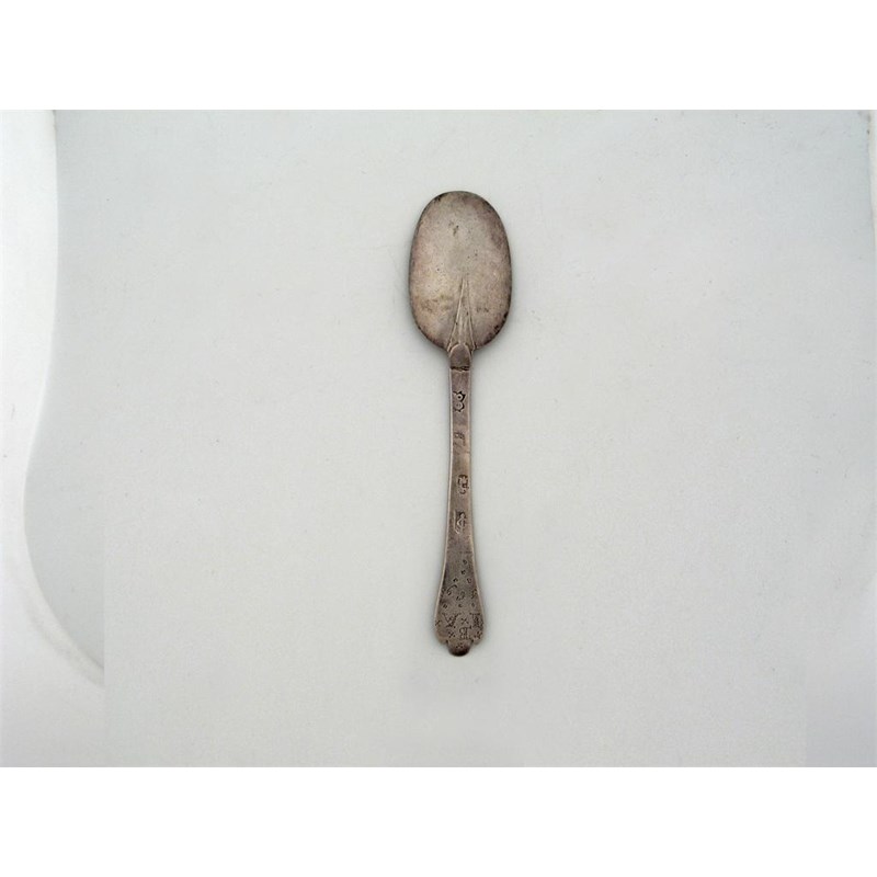 A Queen Anne childs trefid spoon, with plain rattail, pin pricked 'B' over 'IA' over '1695', by Lawrence Coles, London 1709, 5.5in (14.2cm).
