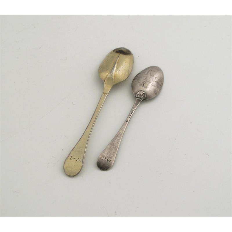 A George I/II silvegilt teaspoon, Hanoverian with plain rattail initials 'WI', makers mark only 'ID', 1725-30 and a George II fancy back teaspoon. (2)