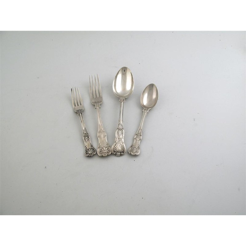 A composite set of Kings pattern cutlery: 6 table spoons, by W. R. Smily, London 1849, 18 table forks, (5 by Aldwinchle & Slater 1893, 4 by Jackson & Fullerton 1905, 6 by W. R. Smily 1849, 3 by George Angell 1853), 15 dessert spoons (7 by Aldwinckle & Slater 1893, 6 by George Adams, 1853/4, 2 by W.R. Smily 1849), 9 dessert forks (5 by George Adams, 1852/3, 4 by Aldwinckle & Slater 1893) 133 oz, 48 pieces