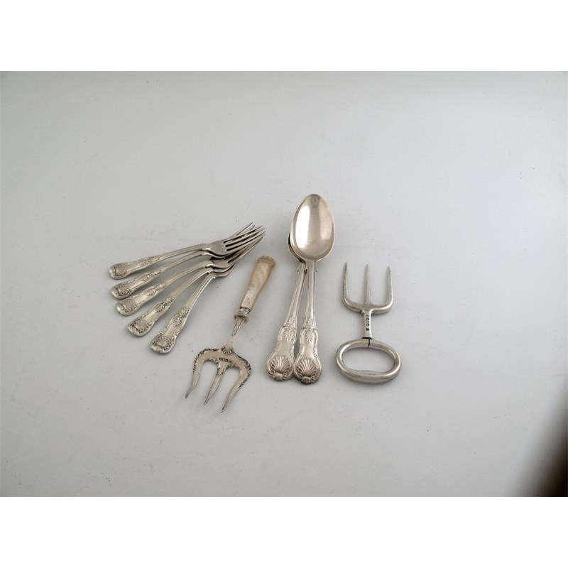 A Victorian ham fork, with oval handle, by Edward Hutton, London 1885, a pastry for with mother of pearl handle, Sheffield 1899, a pair of Queens pattern table spoons, London 1831 and five dessert forks, crested, London 1825, 22oz all in (9)