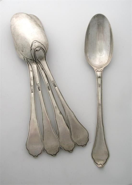 A set of four thread bordered tablespoons, with wavy ends and double drops, makers mark 'AH' [conjoined] and '141/2' together with another very similar tablespoon, by the same maker, also stamped 'G', unascribed, probably 18th century, 9oz. (5)