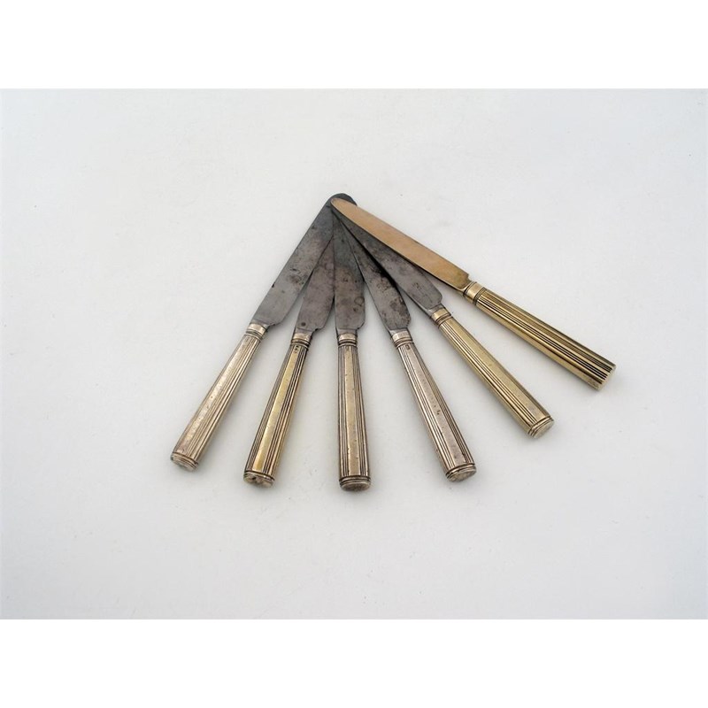 Royal Association: a set of five George III side knives, with reeded handles, and steel fingerpoint blades, each engraved with Royal Insignia and the Prince of Wales, Feathers*, by Moses Brent, London 1795 together with a late unmarked knife of similar design. (6) *For George, Prince Regent, later King George IV.