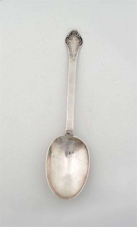A Charles II lace back trefid spoon, pin pricked 'L' over 'I.S', possibly by Nathaniel Brassey, London 1665, 8.25in (20.9cm).
