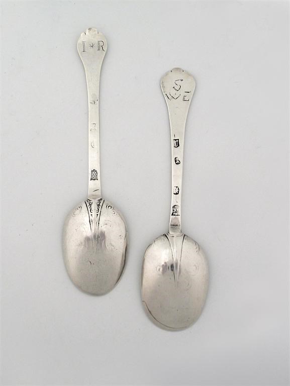 A William and Mary lace-back trefid spoon, scratched 'WE', by Lawrence Coles, London 1694, 7.5in (19.1cm).