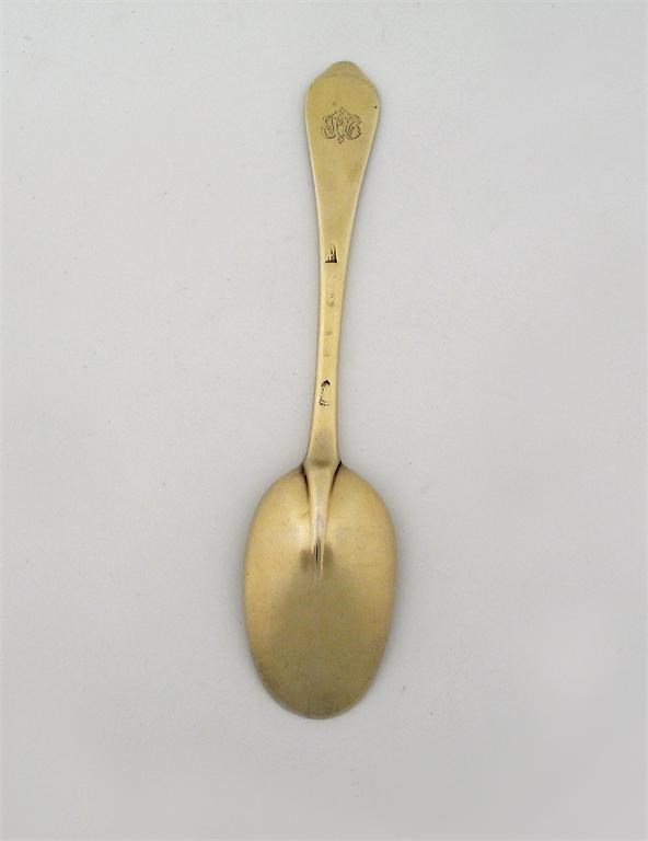 A Queen Anne dog nose spoon, with plain rattail, engraved a cypher, by Lawrence Jones, London 1709, 7.7in (19.6cm).