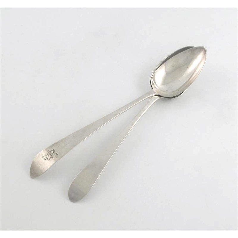Two George III Irish serving spoons, with pointed ends, one crested, by James Brady, Dublin 1797/98, 4oz. (2)