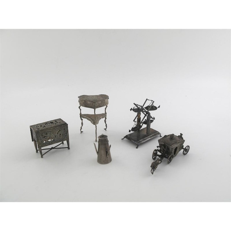 Miniatures or toys: a decorative two tier specimen table with heart-shaped top, a drop leaf table with piercing, a swing-boat ride on an oblong base, a coffee pot pepperette and a coach with footmen and a single horse mixed makers and dates, all antique (5)