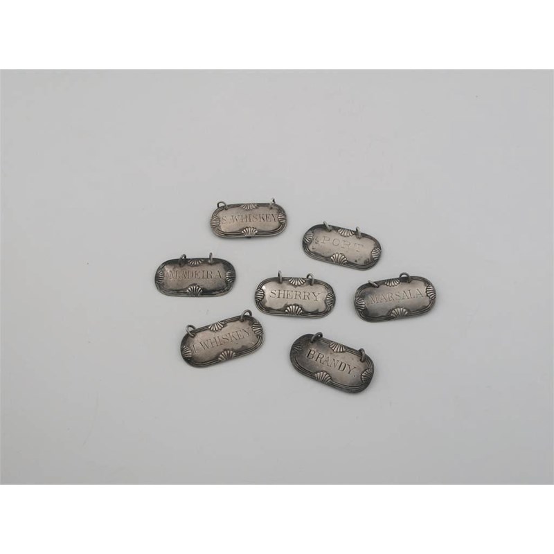 A set of Seven early 19th century wine labels incised 'PORT', 'MADEIRA', 'BRANDY', SHERRY', 'I WHISKY', 'S. WHISKEY' and 'MARSALA', unmarked, 1810-1820.