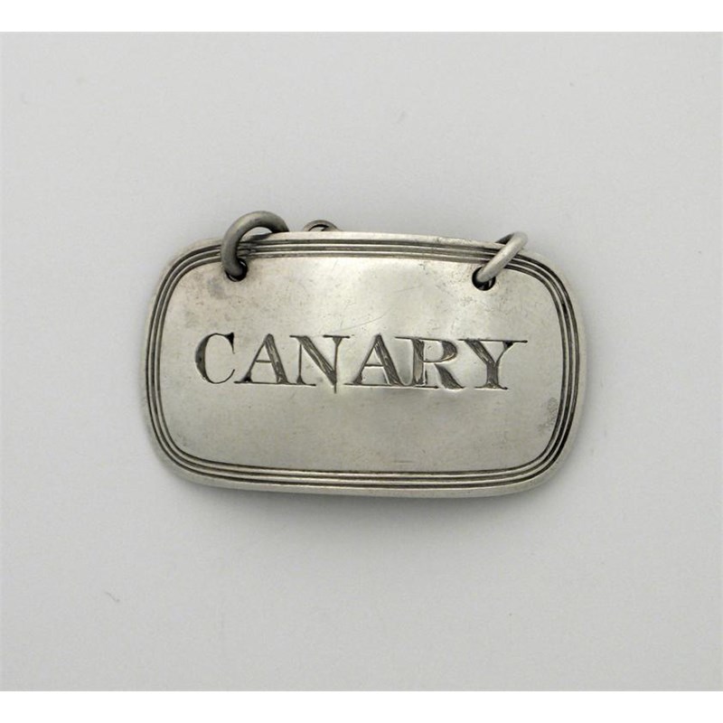 A William IV wine label, rounded oblong with reeding, incised "CANARY" by Joseph Wilmore, Birmingham 1833