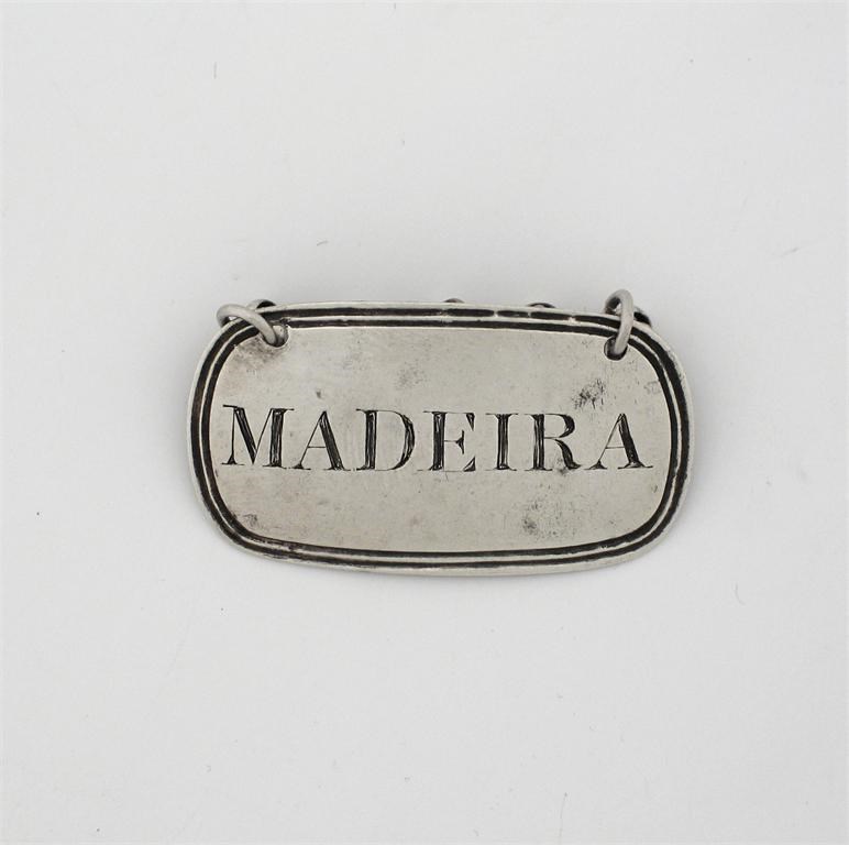 A rare and interesting George IV 'MADEIRA' wine label, Britannia standard, with an incised reeded border, by George Knight, London 1825. Literature: See wine labels 1730-2003 by Salter, p.135, 'Two nineteenth century Britannia stamped labels have been noted, however, one made by George Knight in 1825...'