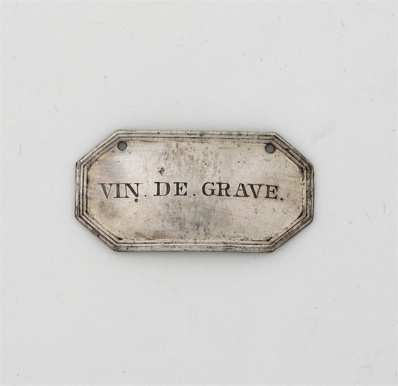 A George III Sheffield plate wine label, incised 'VIN DE GRAVE', with reeded border.
