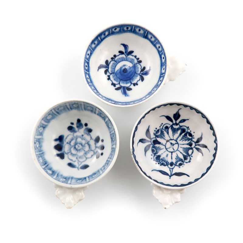 Three Derby blue and white wine tasters, c.1765-75, of shallow circular form, the exteriors with gadroon moulding, each painted to the interior with a large flowerhead within dentil and cell diaper borders, each applied with a short foliate handle, 7.5cm. (3)