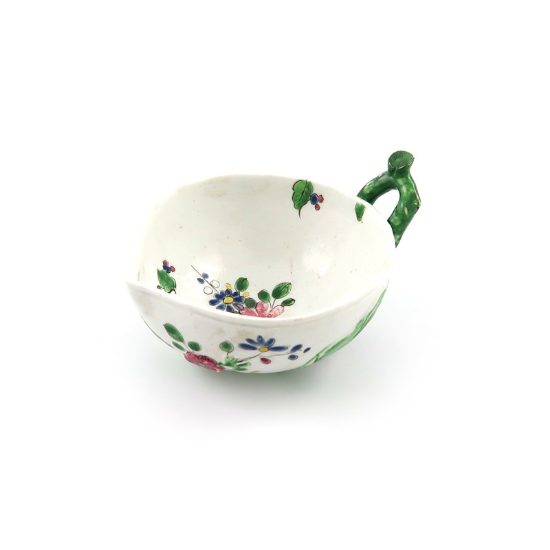 A Longton Hall cup or wine taster, c.1755, the peach-shaped body applied to the exterior with a flowering branch, its stem forming the twig handle, decorated in famille rose enamels with further flower sprays to the exterior and interior well, a filled rim chip, 13.8cm across.
