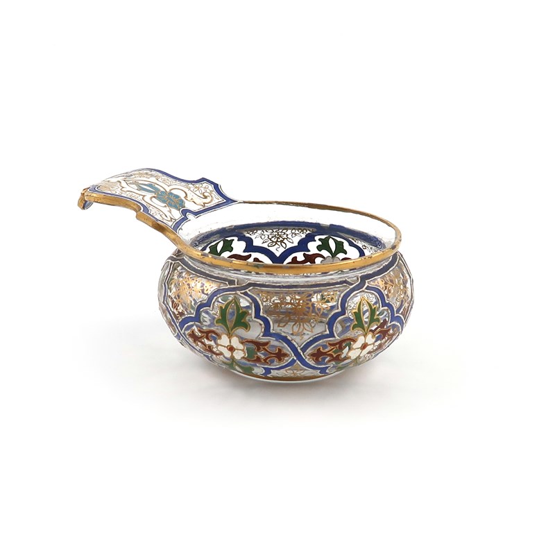 An enamelled glass wine taster, 19th century, probably Russian, the squat circular form finely enamelled in the Islamic manner with formal flowerheads within shaped panels edged in blue and white, with a curved handle, 10.6cm.