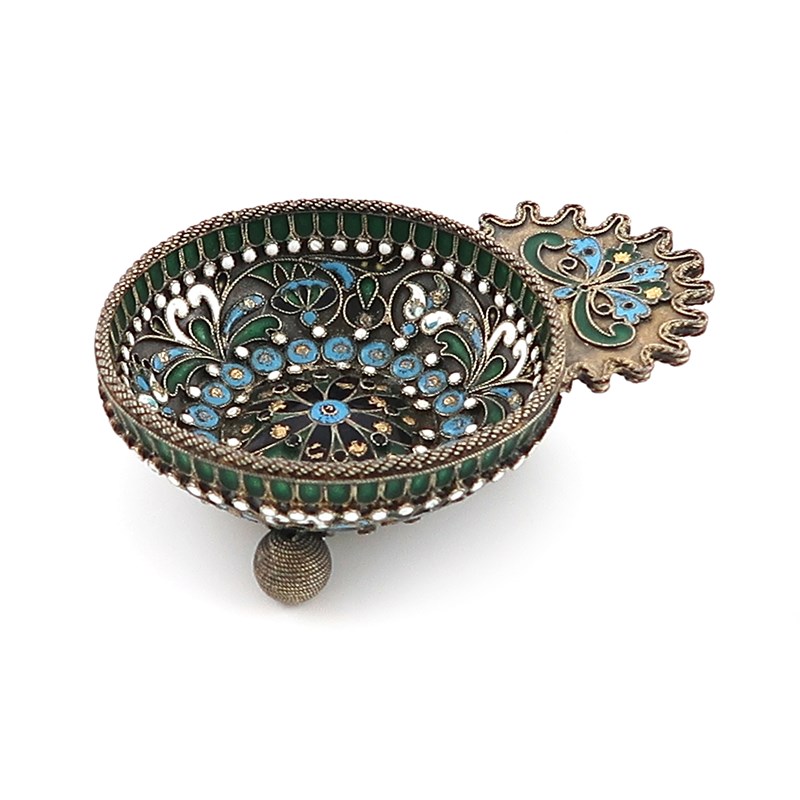 the circular bowl with vari-coloured enamel decoration, the handle with a wavy-edge border and enamel decoration, on three wire-work ball feet, length 8.5cm, approx. weight 2.4oz.