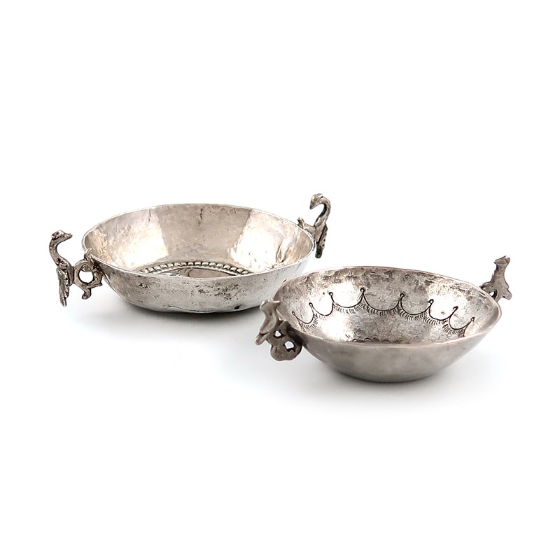 circular form, with stylised bird scroll handles, the centre embossed with a fish, length handle to handle 11.3cm, plus another South American silver wine taster, of circular form, bird scroll handles, engraved border, length handle to handle 9.8cm, approx. total weight 3.2oz. (2)