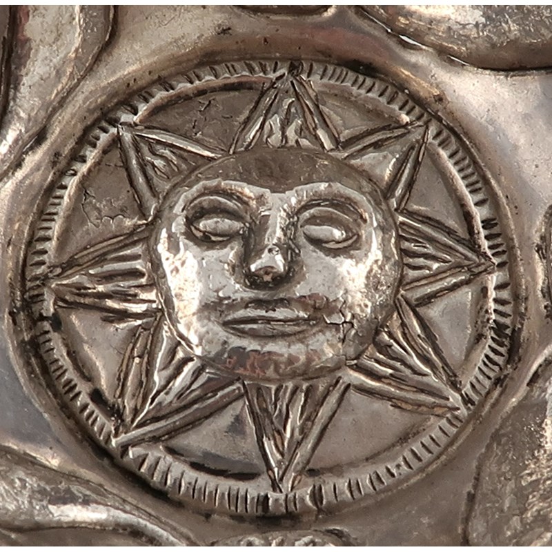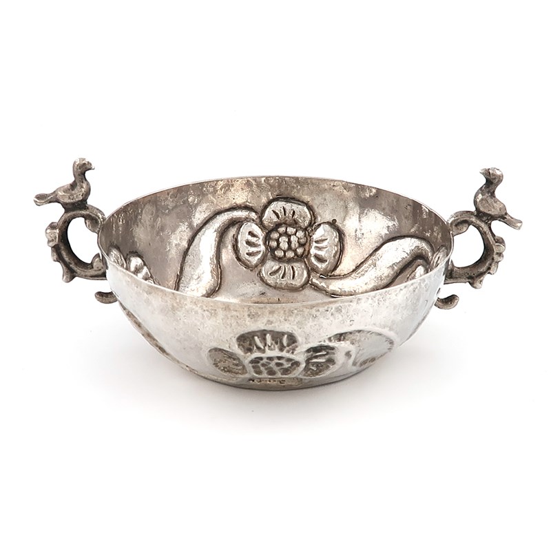 circular form, the centre embossed with a sun motif, embossed foliate and scroll decoration, scroll handles mounted with birds, length handle to handle 12.8cm, approx. weight 2.2oz.