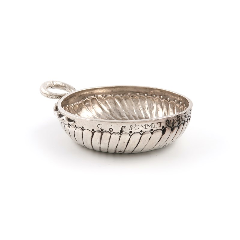 circular form, fluted decoration, snake ring handle, inscribed 'SOMMET LE JEUNE', length 11cm, approx. weight 3.1oz.