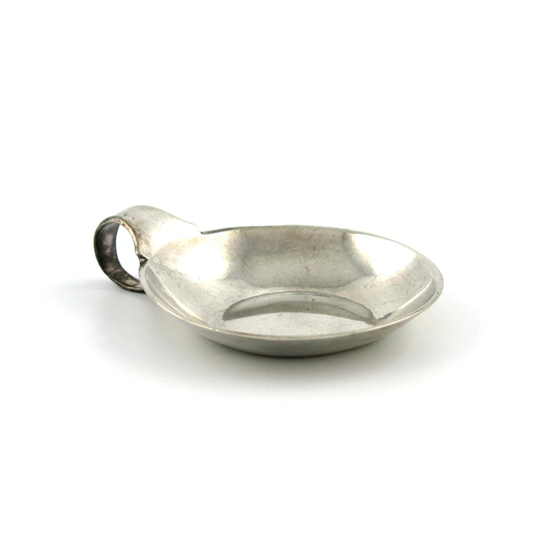 plain shallow circular form, scroll handle, length 9cm, approx. weight 1.9oz.