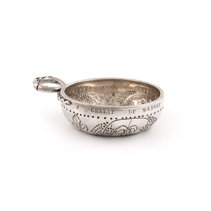 circular form, chased vine decoration, double snake ring handle, inscribed 'J GESSAT DE MASAGE', length 11.4cm, approx. weight 3.7oz.