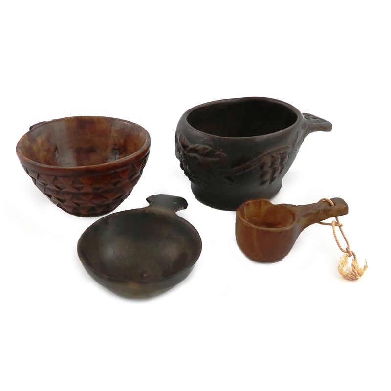 comprising: one of oval form, carved with grape decoration, pierced lug handle, length 11.5cm, plus one of tapering circular form, carved decoration, plus one other and a horn one, of plain circular form, plain handle. (4)