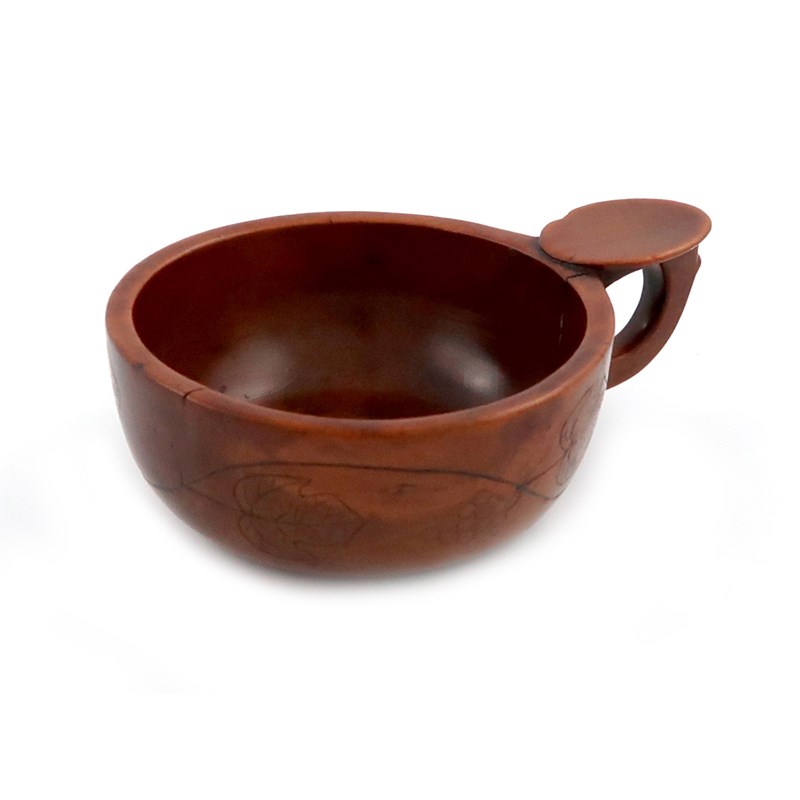 circular form, with a ring handle and plain oval thumb-piece, the body engraved with trailing grapevines, also inscribed 'O.CANCY. PR', length 11.3cm.