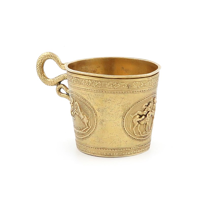 tapering circular form, with classical panels and foliate borders, snake scroll handle, height 4.2cm, approx. weight 1.3oz.