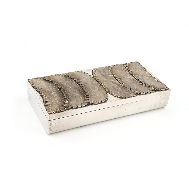 rectangular form, the hinged cover applied with six textured and gilded feather designs, the interior black leather lined and the interior cover gilded, length 17.8cm, approx. total weight 21oz.