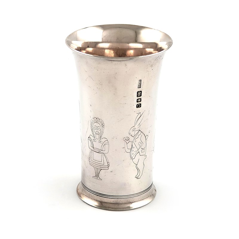 tapering cylindrical form, engraved with characters from Alice in Wonderland, including Alice, the White Rabbit, the Mad Hatter, the Knave of Hearts and a Fish Footman, also engraved with initials 'P.E.L.B', height 10cm, approx. weight 5.8oz.