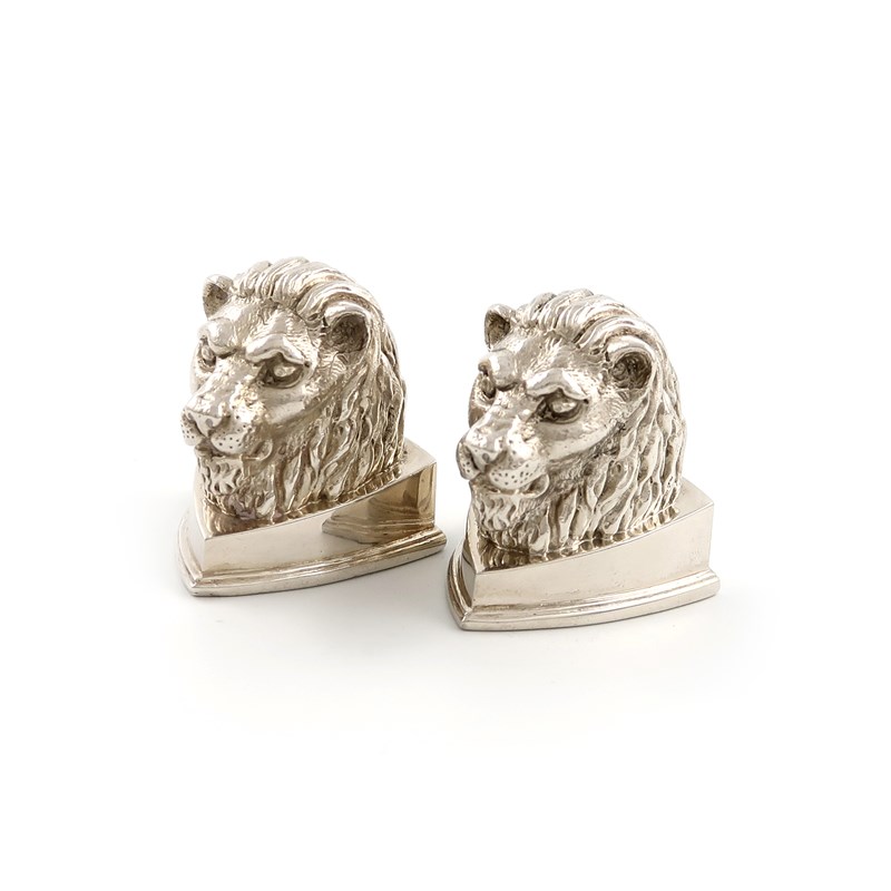 modelled as lion leads, on shaped triangular bases, height 3.5cm, approx. weight 3.8oz. (2)
