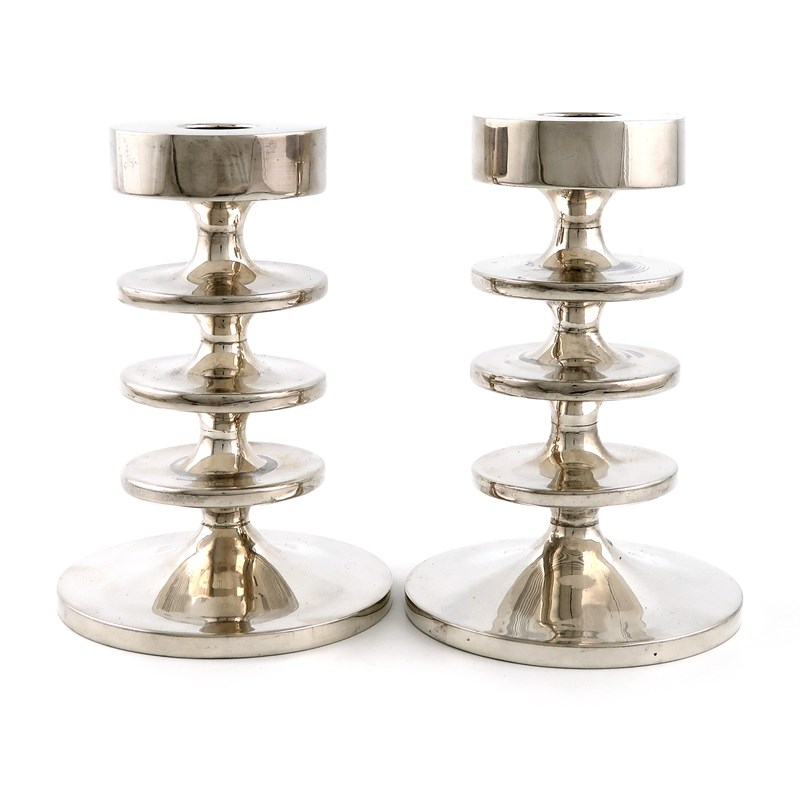 concentric circular disc form, plain circular capitals on raised spread circular bases, height 14.6cm, approx. weight 23.9oz. (2)
