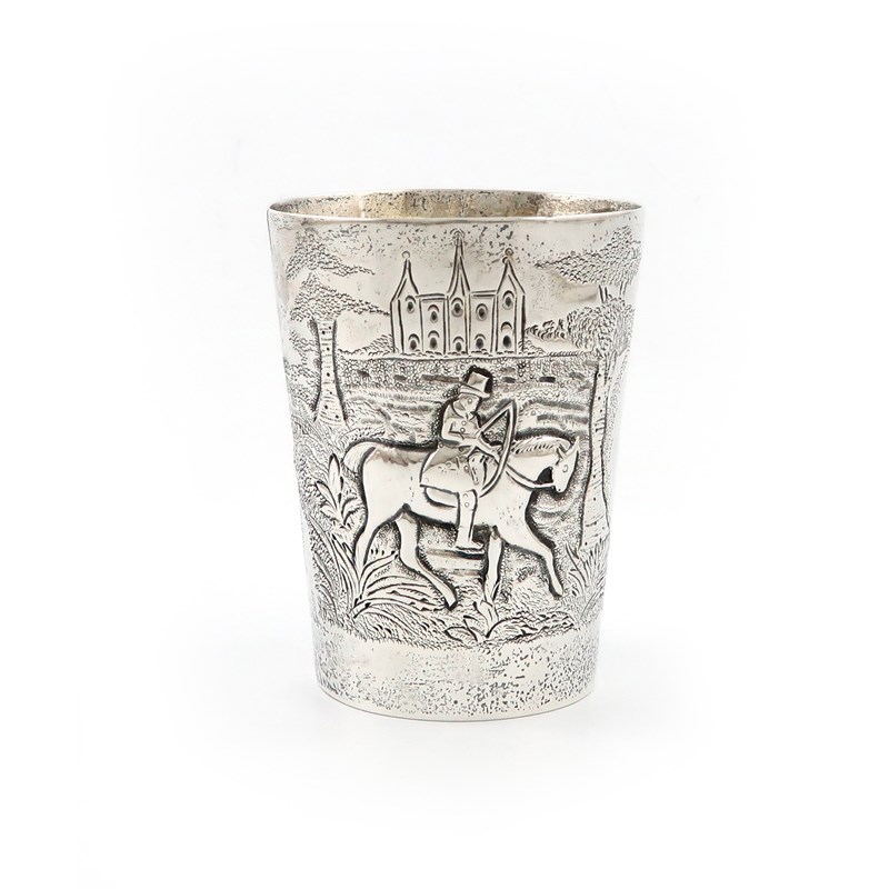 tapering circular form, embossed with a hunting scene with a horse and dogs chasing a hare, within foliate decoration, engraved with a crest, height 9.6cm, approx. weight 6oz.