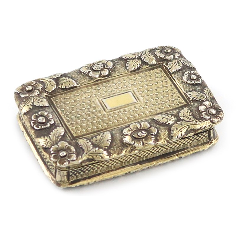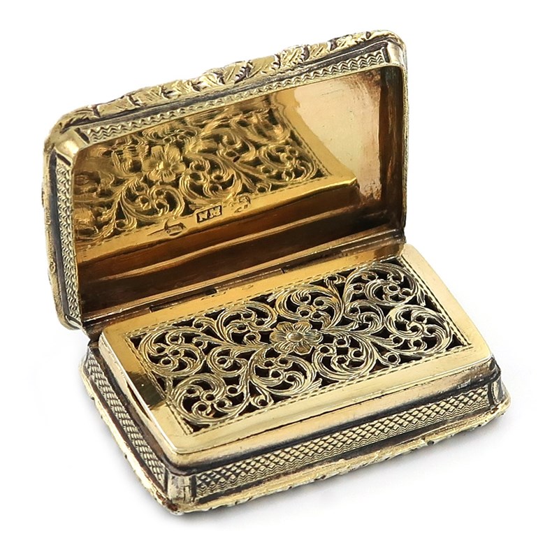 rectangular form, engine-turned decoration, with a heavy foliate border and vacant cartouche, the interior with a hinged pierced foliate scroll grille, length 4.3cm, approx. weight 1.1oz.