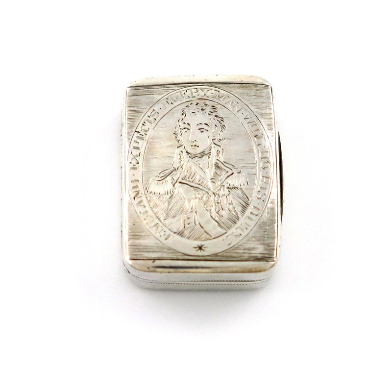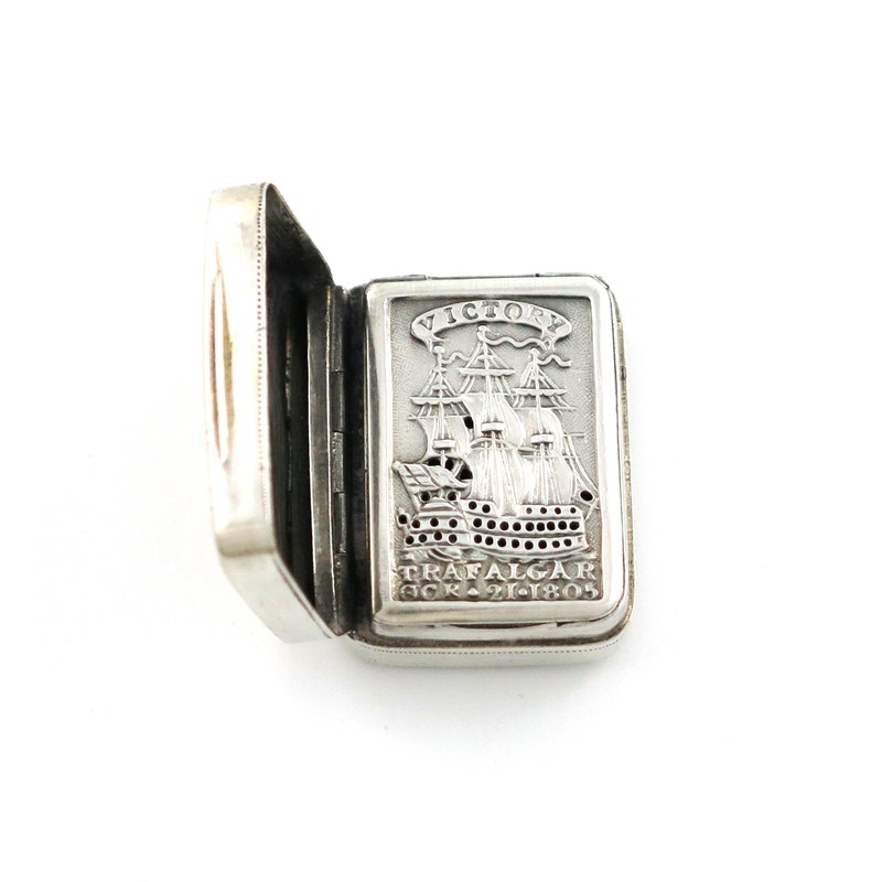 rectangular form, the hinged cover engraved with a portrait of Lord Nelson and engraved 'England Expects Everyman Will Do His Duty', the interior with a hinged grille embossed and pierced with H.M.S Victory and 'Victory Trafalgar OCR 21 1805', length 2.9cm, approx. weight 0.5oz.