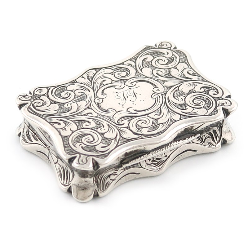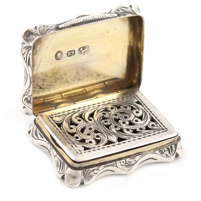 shaped rectangular form, engraved foliate scroll decoration, the hinged cover initialled, the interior with a hinged pierced and engraved grille, length 3.8cm, approx. weight 0.6oz.