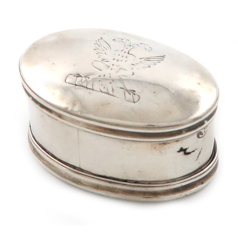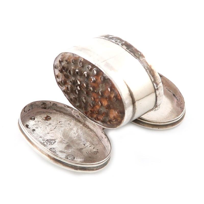 oval form, hinged cover and base, the hinged cover with a crest, the interior with a steel grater, the underside of the base scratch initialled 'M.G', length 4.3cm, approx. weight 1oz.