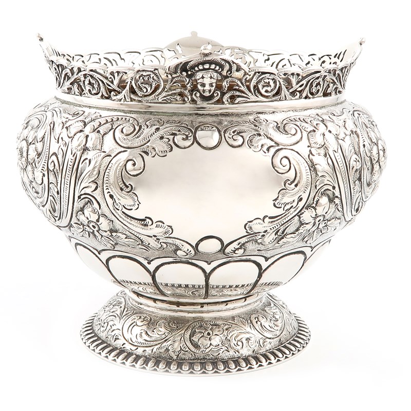 circular form, embossed foliate scroll decoration, pierced foliate scroll border, on a raised foliate scroll foot, height 14.8cm, approx. weight 22.5oz.