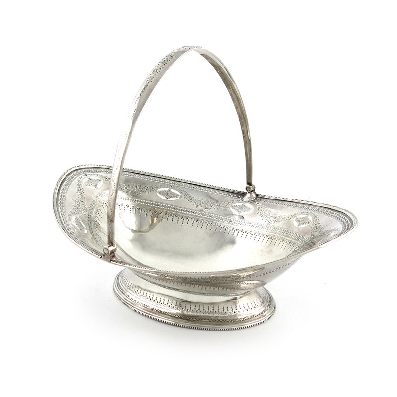 oval form, pierced and engraved foliate and garland decoration, beaded outer border and engraved swing-handle, on a raised oval foot, length 33.7cm, approx. weight 20.8oz.