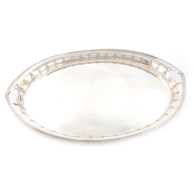 oval form, inset handles, applied cut-card decoration, reeded border, length handle to handle 62.3cm, approx. weight 118oz.
