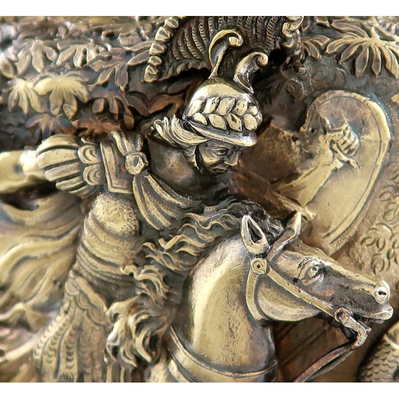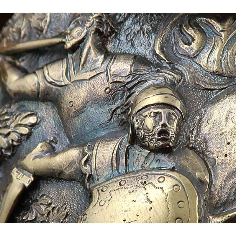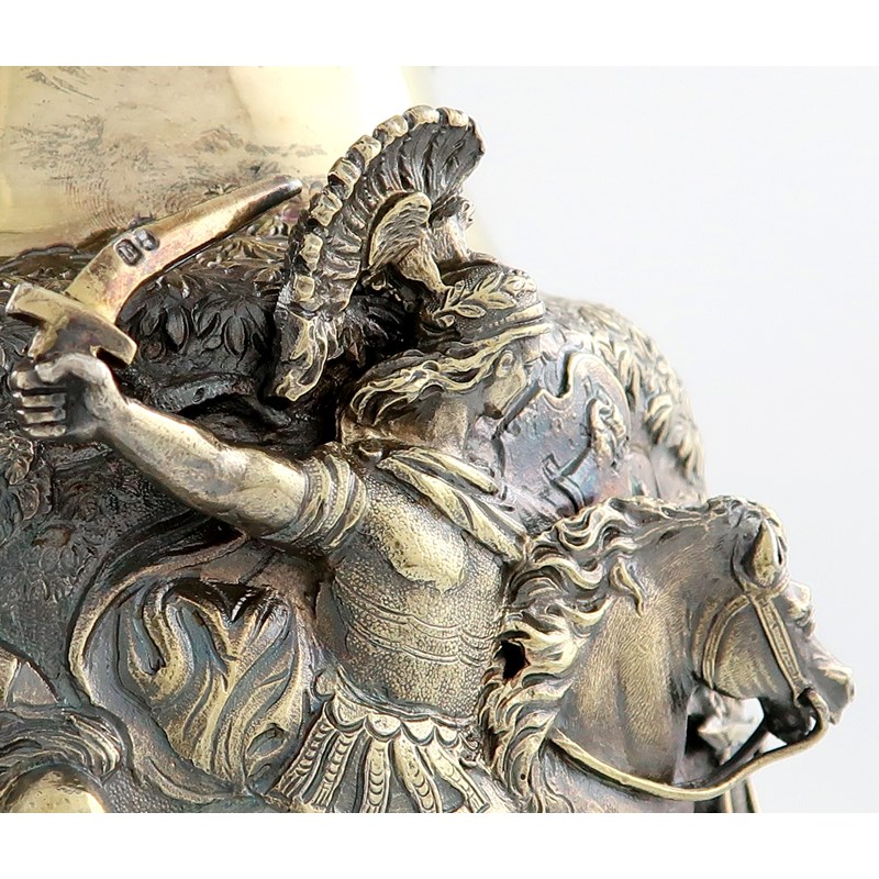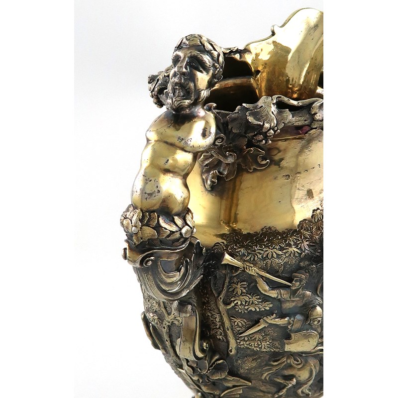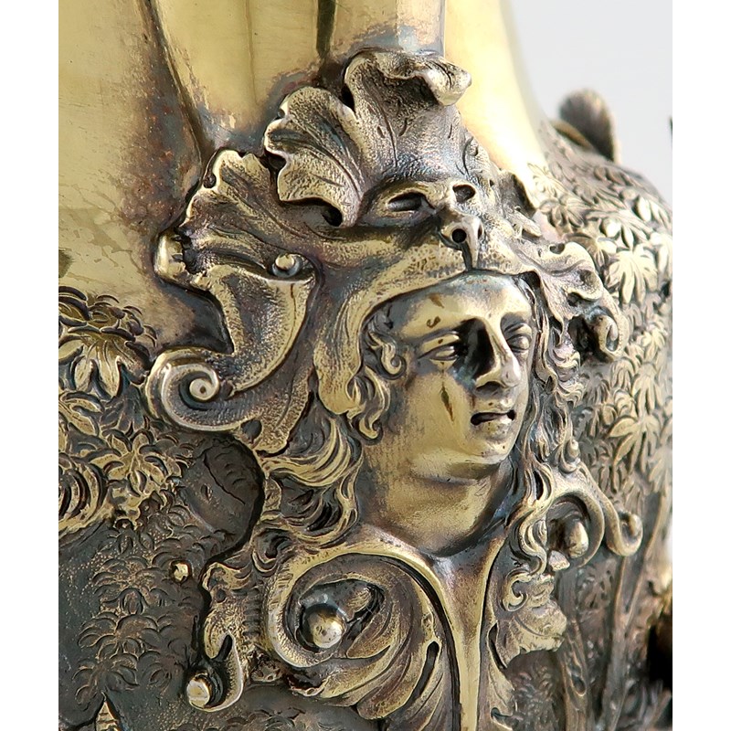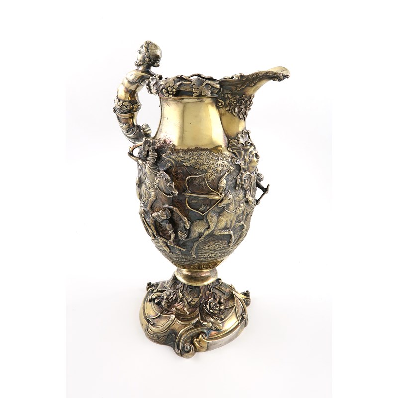 baluster form, on a raised Rococo scroll foot, the body chased with battle scenes, and with a male caryatid scroll handle, the spout with a garland of flowers and a mask motif, the top of the ewer with a trailing vine border, height 34.5cm, approx. weight 83.2oz.