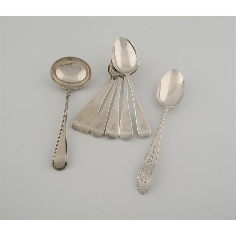 A mixed lot: a set of six Victorian Old English pattern dessert spoons, initialled, by S. Hayne & D. Cater, London 1839; together with an Irish bright-cut tablespoon and a thread pattern sauce ladle, 11oz. (8)