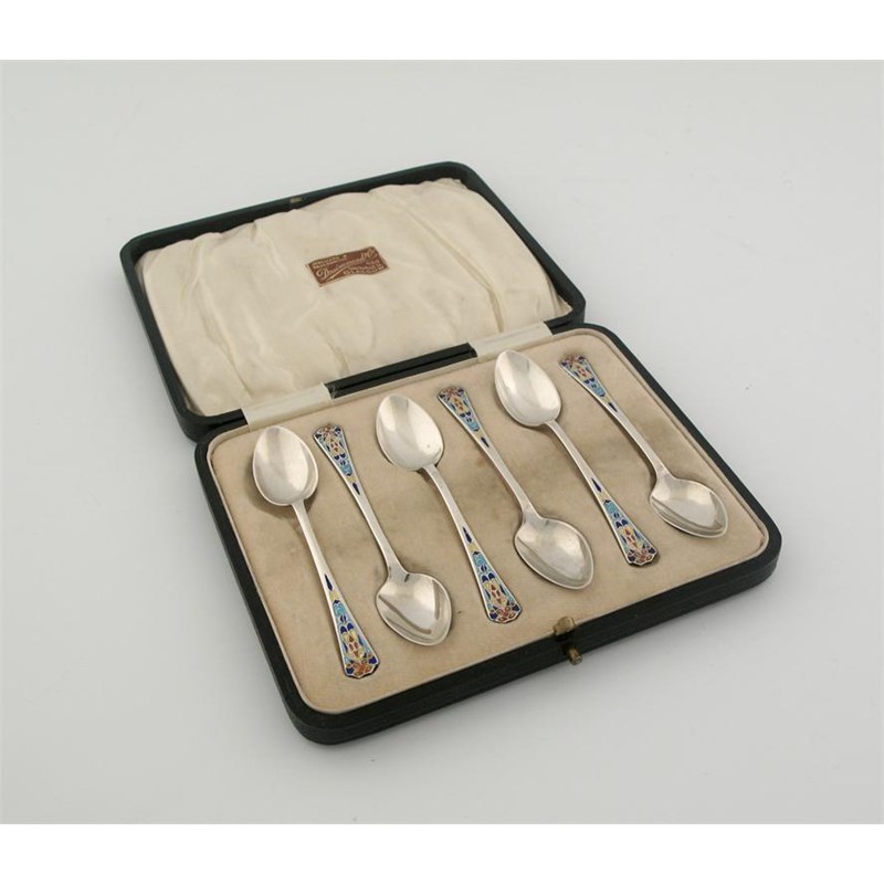 A cased set of six modern coffee spoons, with enamelled terminals, by Barker Bros. Ltd., Birmingham 1943.