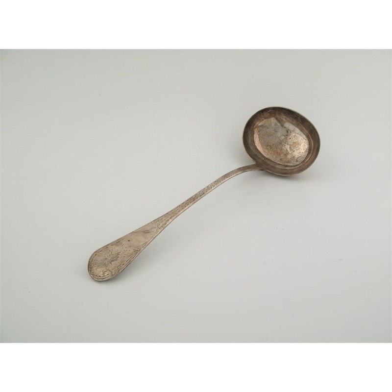 A Victorian Irish soup ladle with a bright-cut stem, maker's mark of C. Cummins, Dublin 1866 (struck also with a retailer's mark 'G Bro?'), 7oz.